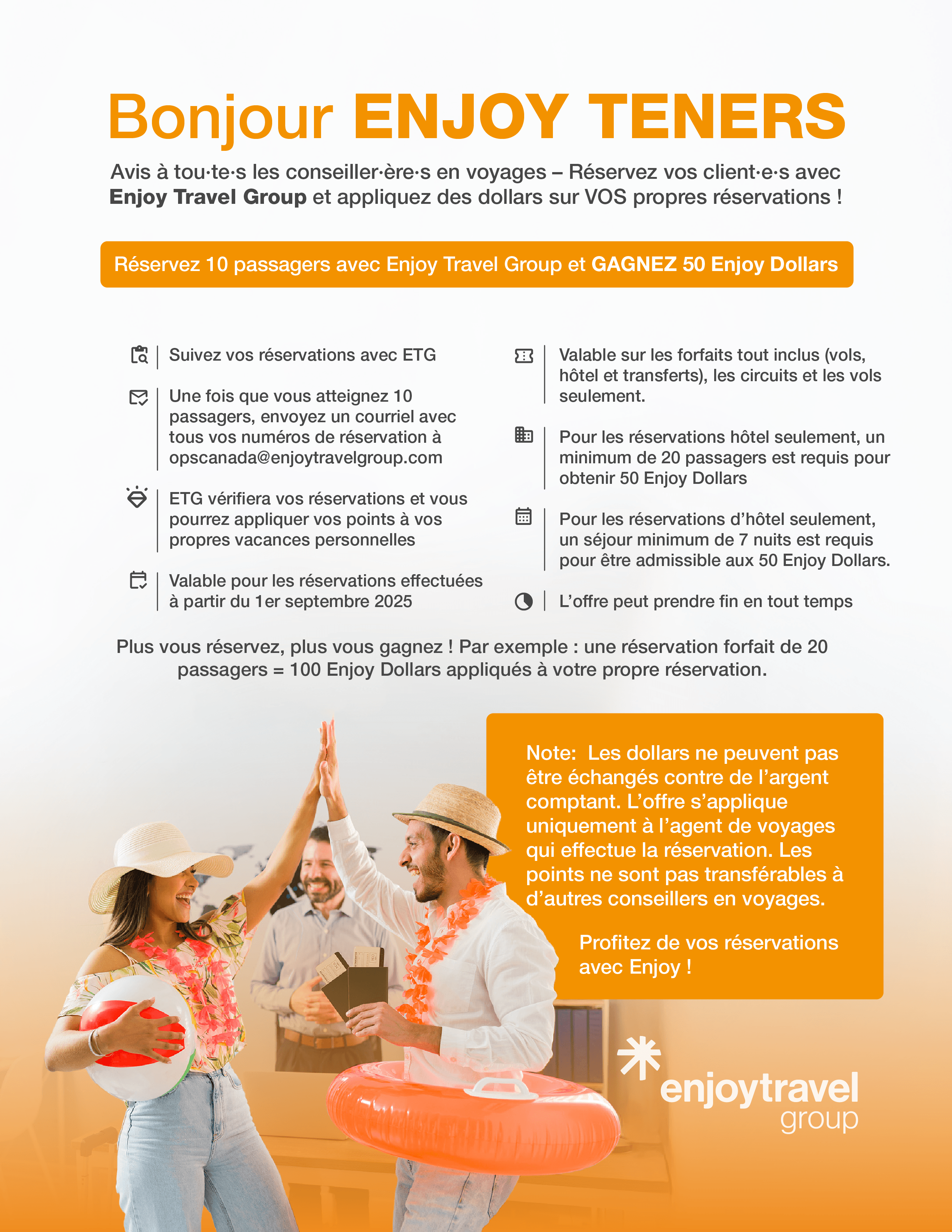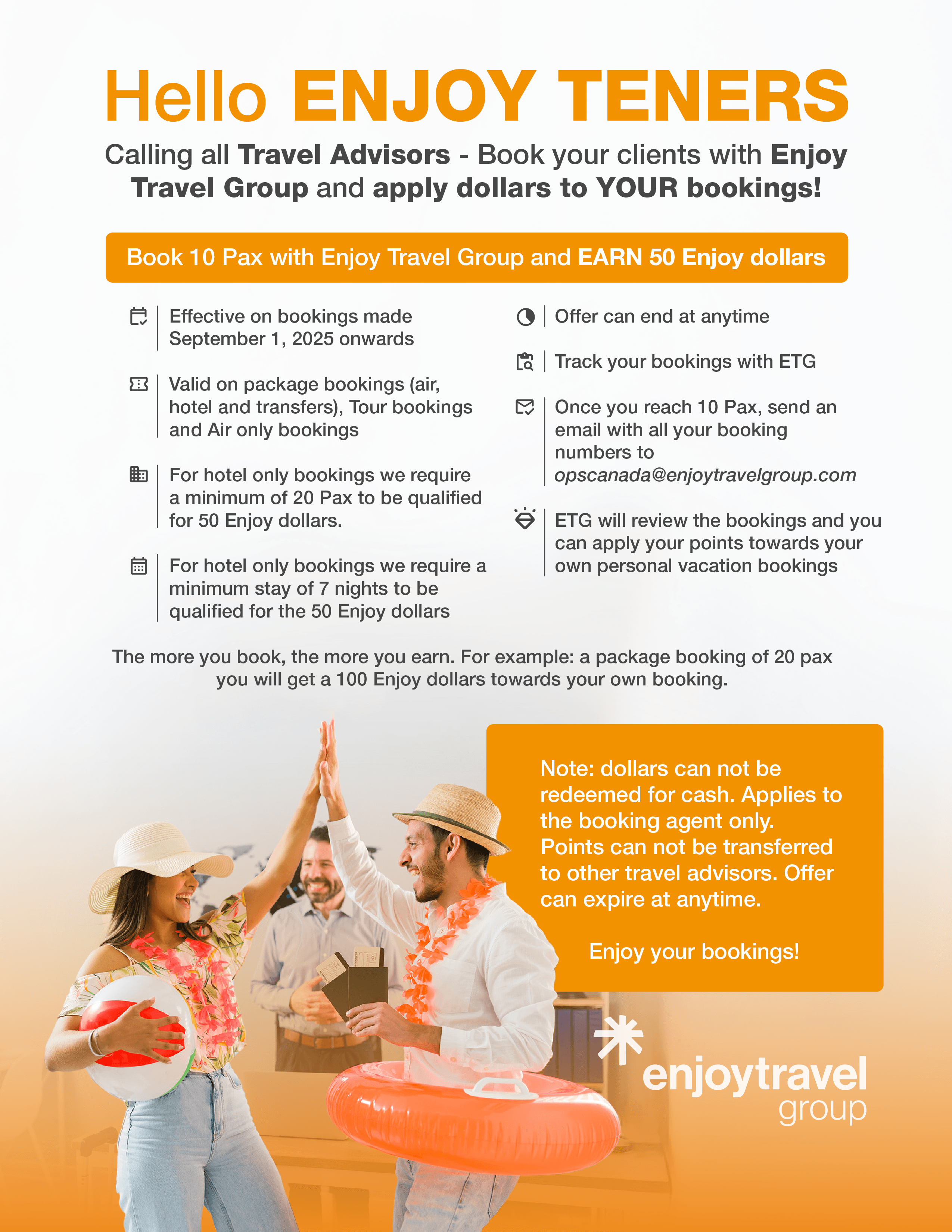 If you have any further questions, please email Sara Pula, Business Development Manager at bdm1.ca@enjoytravelgroup.com.