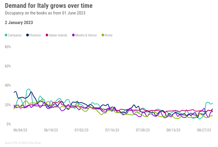As the months continued to roll in, demand across all markets grew. By May, it was the leading tourist destinations of Florence and Rome that had the largest proportion of rooms sold. Yet at periods in July, the Italian Islands managed to grab the top spot in relation to future booking levels.
